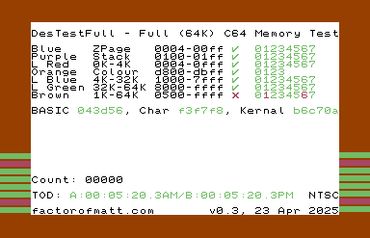 The DestTestFull solution can test the entire 64K of available memory in your Commodore 64 using the same March-B algorithm as the DesTestMAX 4K testing cartridge.