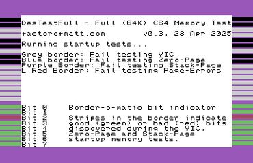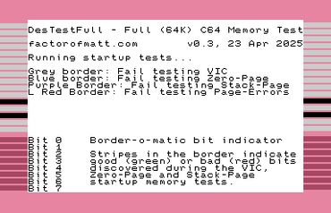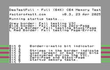 While your Commodore 64 doesn’t need to be fully working in order to run DesTestFull, the CPU, VIC-II, PLA, kernal ROM and the stack-page memory ($1F0-$1FF) must be functional. The basic ROM, character ROM, SID and CIAs are not required.